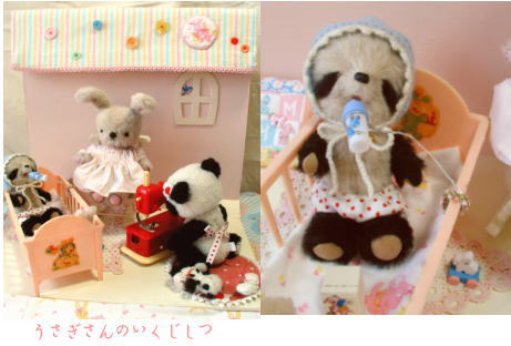 ![]() *ミルクのみパンダちゃん♪ 13cm アンティークの手編みのお帽子をかぶっています。 この展示のために、お姉さんウサギや、ママパンダ&子パンダをお借りしました。こころよく承諾してくださった里親様、ありがとうございました。 |