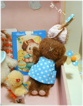 | *ブラウンバニー「ミミ」とヒヨコの「ドット」ちゃん 茶色ウサギ耳含む26センチ うさちゃんのワンピースはビンテージのブルーのドット柄。 この夏emoのお気に入り生地です(^^ ひよこちゃんの羽(自由に曲げられます)の裏にも使っています(笑) こちらのひよこちゃんおしりふふりふり系ニュータイプ♪ あれ〜ウサギ狩りにあっちゃった!? お耳をとめられたらちょっとかわいそうですね〜(^^; ![]() |
