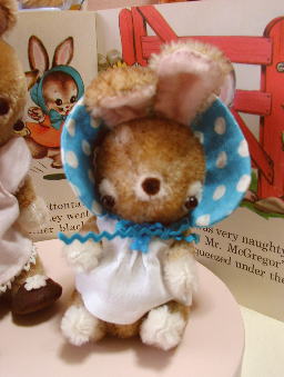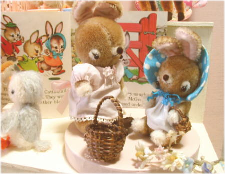 ![]() *うさぎさんおやこ* ママの方は 手染めのピンクの綿ローンでできたワンピースとお花のついたちっこいサンダルを履いています。 ドレスにつけたタティングレースは、アンティークのベビードレスについていたものを すこしづつ丁寧にはずして付け直しました。大きなかごを持ってさあお出かけ〜 娘さんうさちゃんは ビンテージの生地で作ったボンネットと 真っ白い綿ローンでつくったワンピースを着ています。ちっちゃい籠を何でいっぱいにするのかしら♪(^^ |