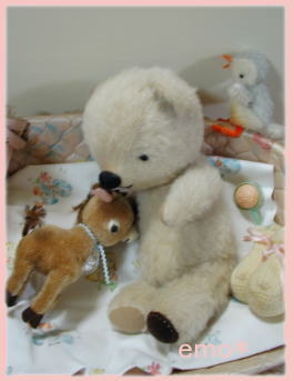*Bear バニラ 身長30センチ 体重500g 赤ちゃんみたいなこのこは 生まれて初めてモヘアのベアに出会った時、さわるとほかほかあたたかくて、本当に生きてるのでは??と錯覚したのを覚えています。だれかにこの感動を伝えたい(笑) 赤ちゃんみたいにおなかがほにゃほにゃで、ずっしりとした重みがあって・・・本当はだっこしてもらえるといいのだけど(^_-)♪ *いまやemo’sの一番人気?(笑) ヒヨピンつきロバちゃんと一緒♪ ロバちゃん 身長15センチ 体重50g ロバちゃんはあんよやしっぽが自由にまげられます♪ |